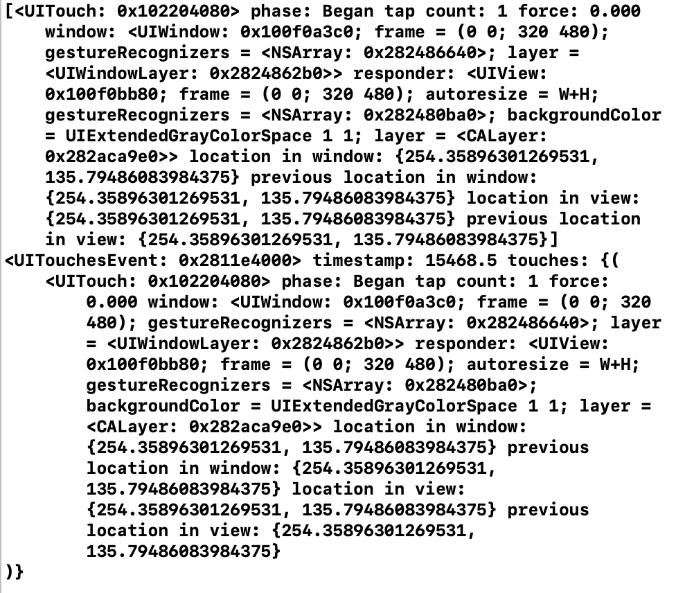 <UITouchesEvent: 0x2811e4000> UITouchesEvent 클래스의 인스턴스입니다. 터치 이벤트를 나타내는 객체입니다.