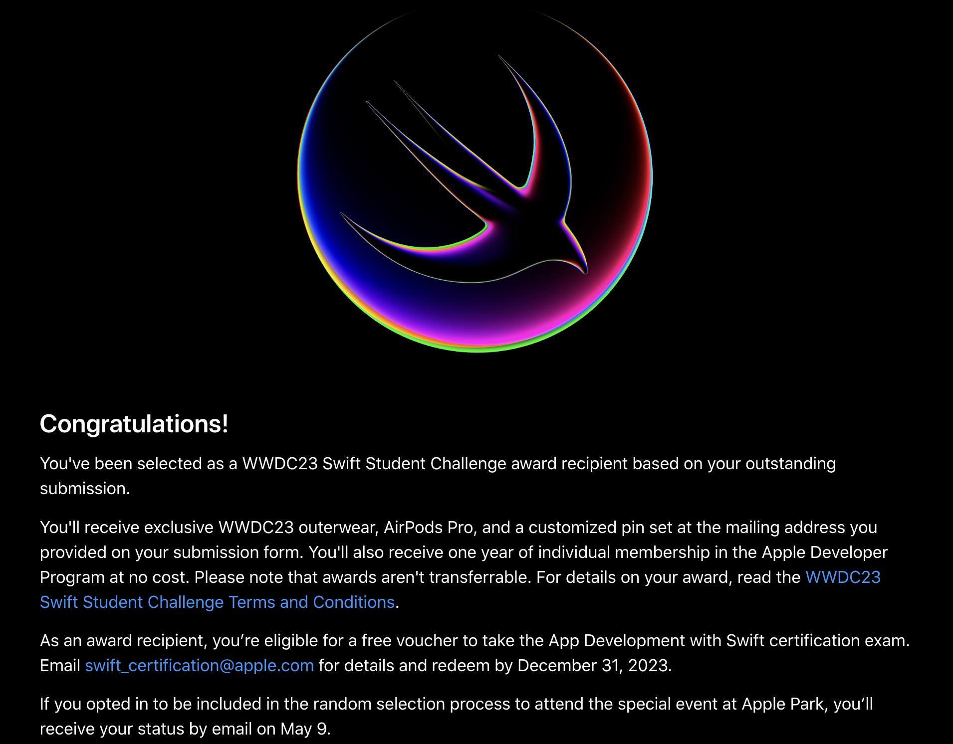두번째로 2022년에 이어 2023WWDC Student Challenge에도 장학생으로 선발될 수 있었습니다!!!