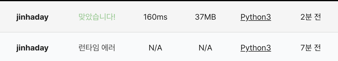 1. 실패 -> 모두 탈출할 경우 return 값이 없어서 NoneType 오류 발생.
