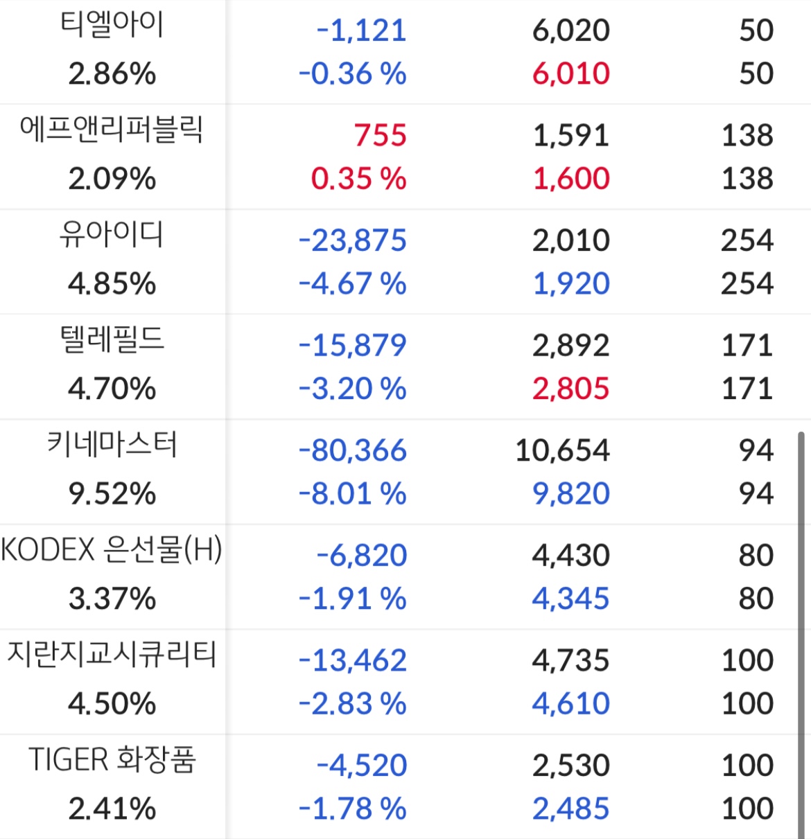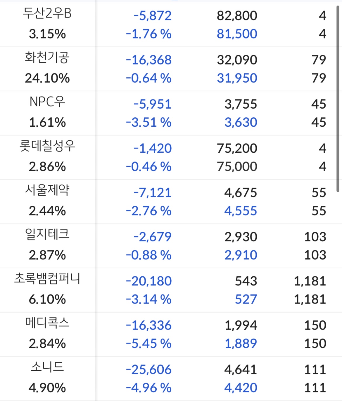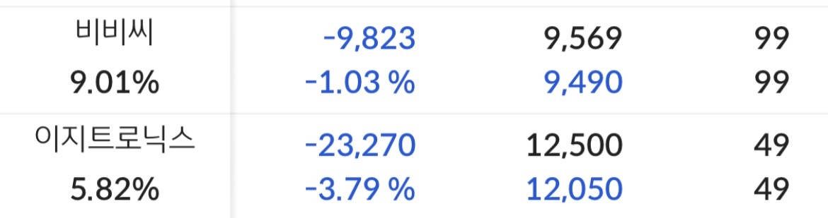 역시나 전체적으로 파랗고. 심지어 -10프로 찍어버린 종목도 꽤나 있었다. ( CB 발행 엄청 했던 회사여서 설마설마 했는데, 역시나가 역시나 였다. 인간의 욕심은 끝이 없고 같은 실수를 반복하지)