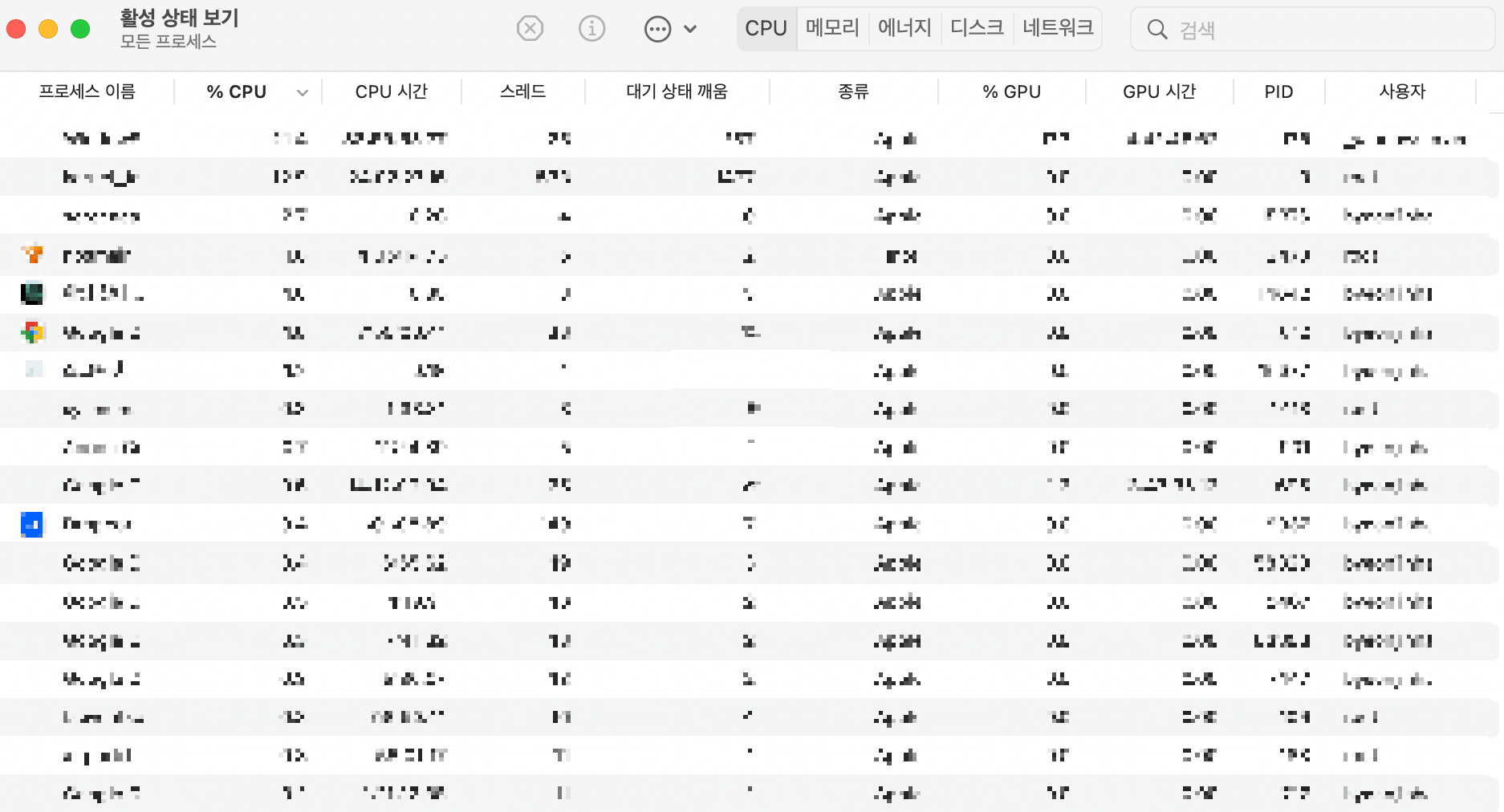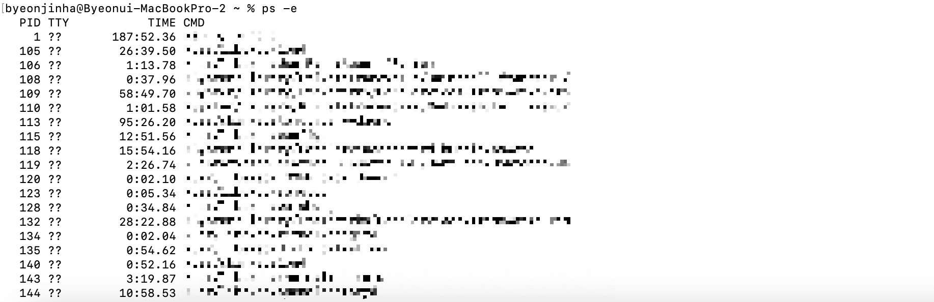 Mac용 활성 상태 보기 앱을 통해서 확인이 가능하고 맥 또한 유닉스 기반으로 한 운영체제이기 때문에, 터미널에서 ps -e명령으를 통해서도 가능합니다 :)