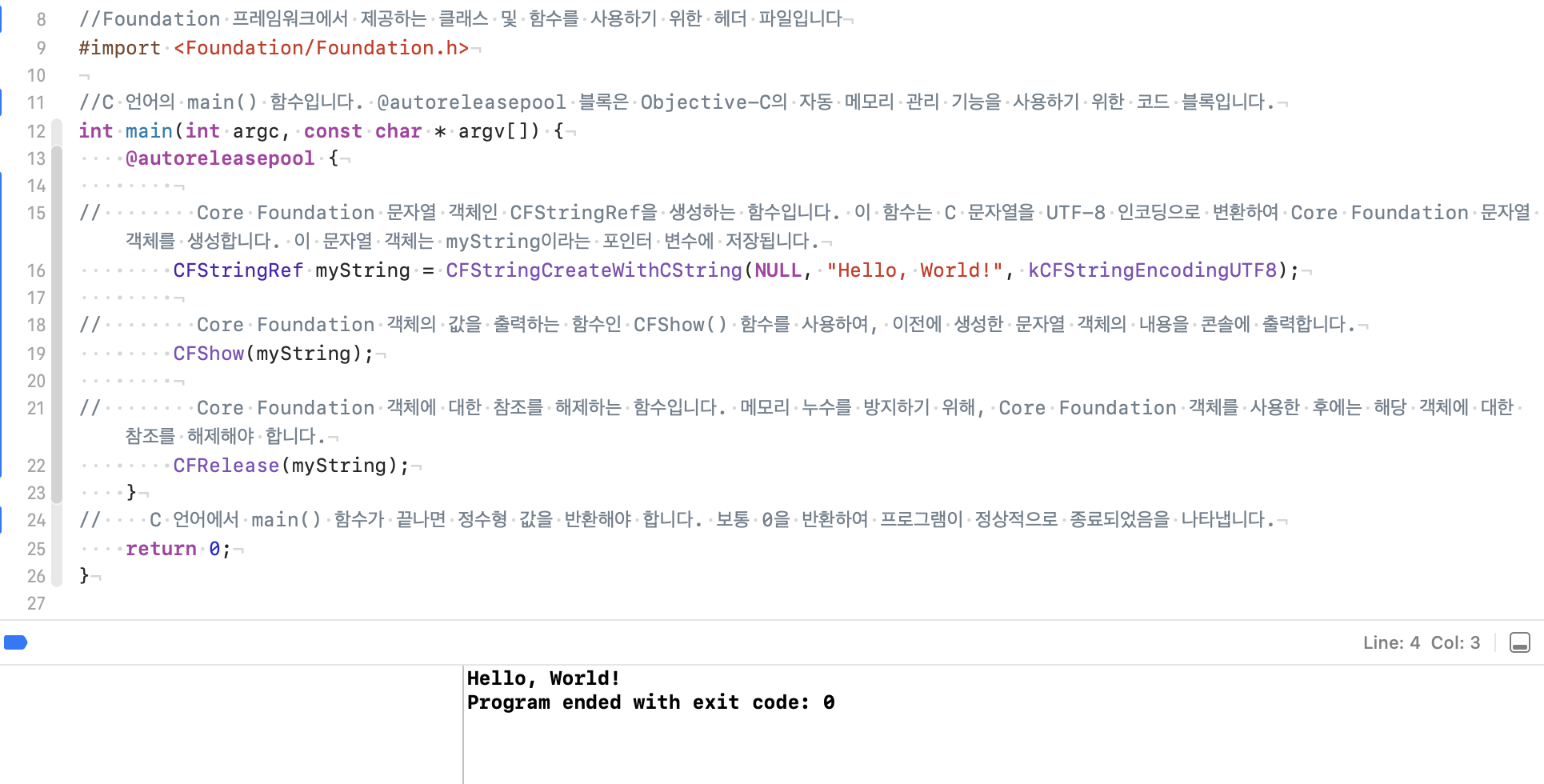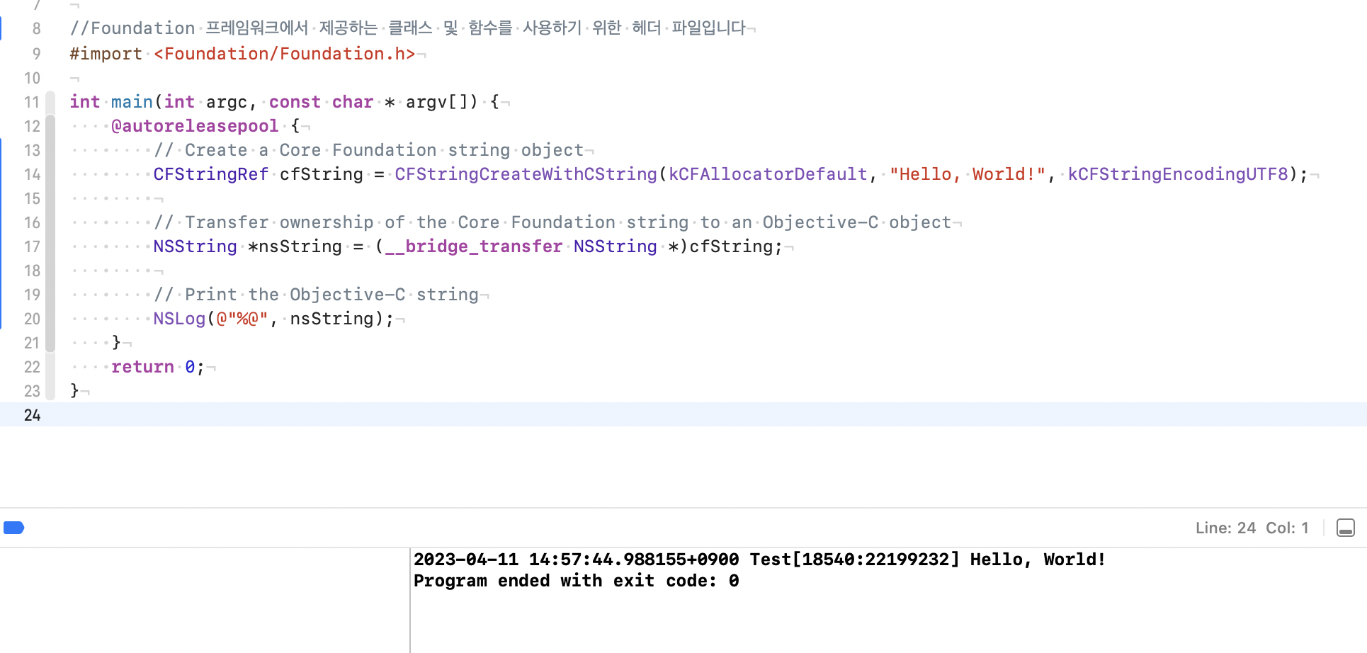 //CFStringCreateWithCString 함수를 사용하여 "Hello, World!" 문자열을 포함하는 Core Foundation 문자열 객체 cfString을 생성합니다. kCFAllocatorDefault 매개변수를 사용하여 문자열 객체에 대한 메모리를 할당합니다. kCFStringEncodingUTF8 매개변수를 사용하여 문자열이 UTF-8 인코딩되도록 지정합니다.