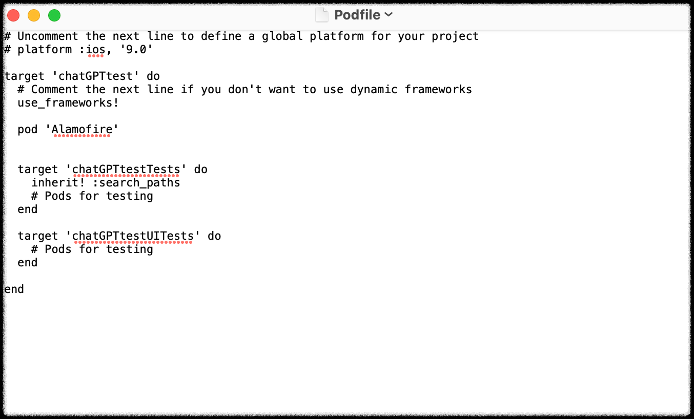 따라서, iOS 프로젝트에서 OpenAI API를 사용하려면, Alamofire 라이브러리를 사용하여 API 호출 및 JSON 파싱을 구현하면 됩니다. Podfile에는 다음과 같이 Alamofire를 추가할 수 있습니다.
